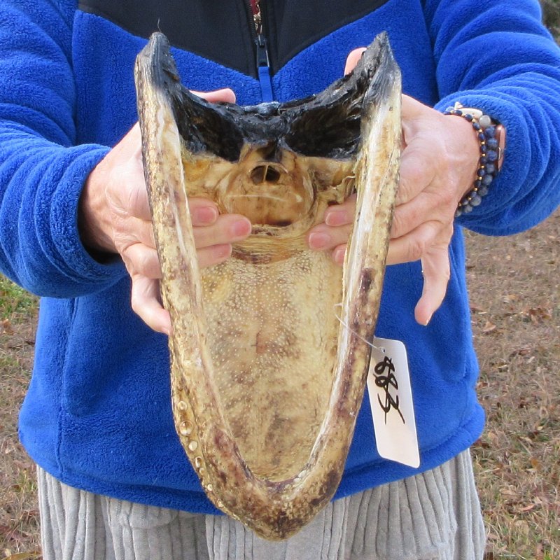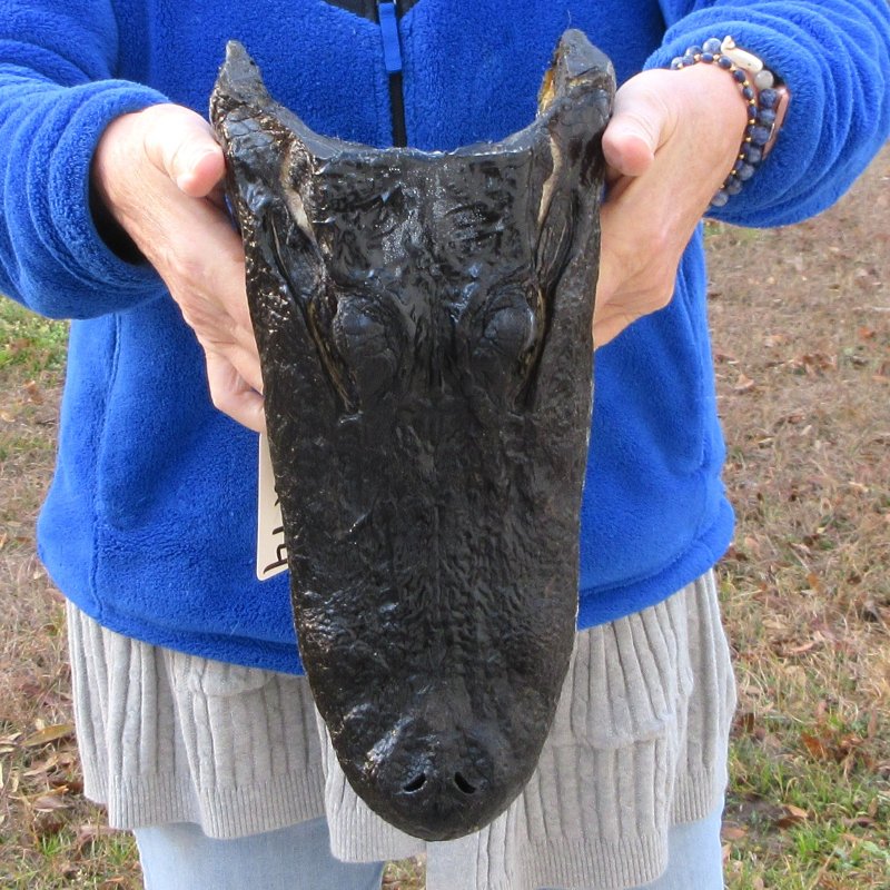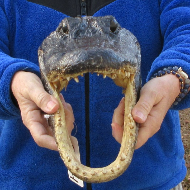 This alligator head measures approximately 12 inches long and 5-1/2 inches wide. This is a real alligator head -- NOT a replica. It will have missing and worn teeth, cuts, scrapes and scars -- Small white dots. Review all photos. Alligator head souvenirs are a profitable retail product for beach shops, souvenir and gift stores catering to gator football fans, tourists, reptile collectors, teachers, students, and collectors of unusual items. A taxidermy process cures the alligator skin and the alligator skull so it will be preserved for years. These gator heads come from gator farms who harvest the gators for their meat and hide.