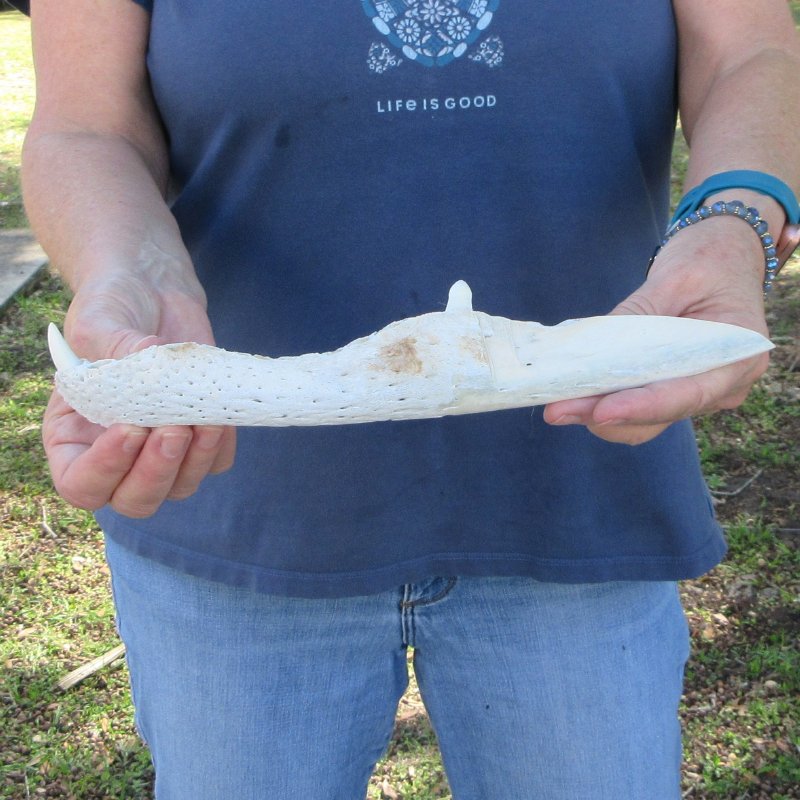 12 inches long alligator bone knife, hand carved gator bones. Alligator bone knife hand crafted out of a real gator jaw bones. This alligator bone knife carved out of an gator jaw bones measures approximately 12 inches long and has a small alligator tooth on the handle side. - Review all photos. Alligator bone knives make great gifts for gator football fans and for collectors of gator bones.
