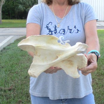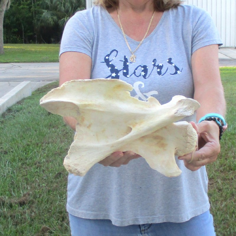 B-Grade Giraffe Vertebra Bone (Giraffa camelopardalis) for sale measuring approximately 12 inches long and 7 inches wide. - Piece missing. Review all photos. This giraffe vertebra bone is from a real African Giraffe's neck and will have some stains and natural imperfections normally found on all wild animal bones.