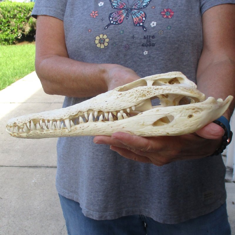 B-Grade Nile Crocodile Skull (Crocodylus niloticus) from South Africa measuring approximately 12 inches long and 5 inches wide. - Holes in skull. Review all photos. This Nile crocodile skull has been thoroughly cleaned and partially whitened and is ready for display! The cleaning process used on all skulls to remove the residue of skin, tissue, etc. causes some of the teeth to come out of the skull. The teeth have been glued back into the skull, however some may be missing. They will have imperfections due to the natural aging process and living in the wild--scars, blemishes, rub areas, broken teeth, bug bite marks, etc. These crocodile skulls are by-products of Africa's farming industry. All products were professional cleaned in South Africa and cleared by the U.S Fish and Wildlife Services and U.S Customs Services for legal entry into the United States.