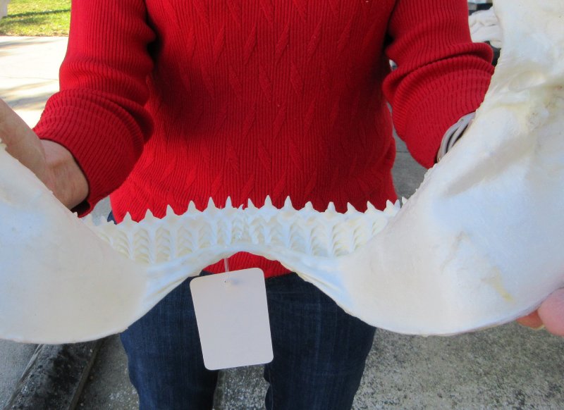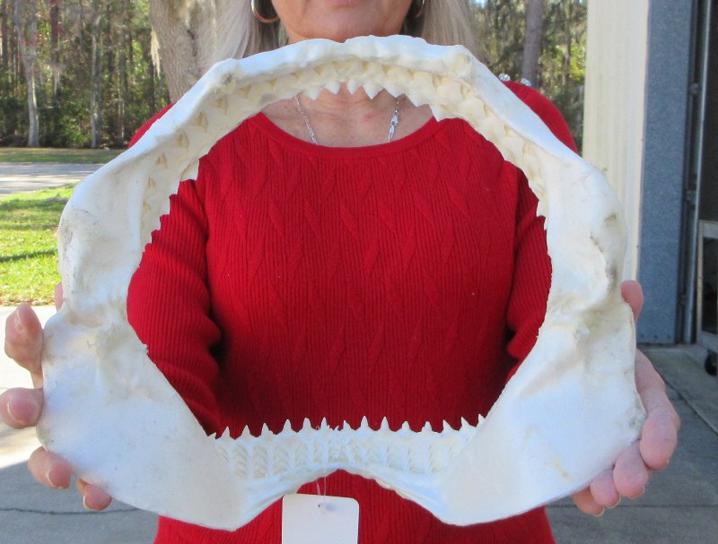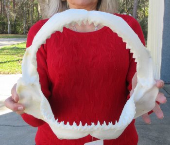 Bull shark jaw (Carcharhinus leucas) for sale measuring approximately 12 inches wide and 10 inches tall, measured straight across from left side to right side. Our shark jaws are imported from Taiwan and have been cleaned and whitened.  Shark jaws are used for display and for shark collectors. They are real and will have imperfections such as cuts or scrapes on the cartilage area, some missing or broken teeth, some small holes in the cartilage and there may be an odor from the cleaning agents used.