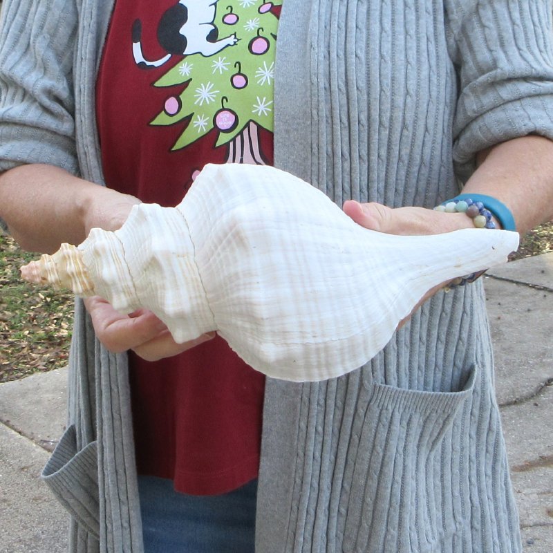 Horse conch for sale, Triplofusus giganteus, common name the Florida horse conch. It measures approximately 12 inches in length.  This species is the largest gastropod in the American waters. - Crack and hole in shell. Review all photos. These beautiful large seashells are used in coastal home decorating and seashell decor. The horse conch is the official state seashell of Florida. The shell is popular with shell collectors partly because of its great size.
