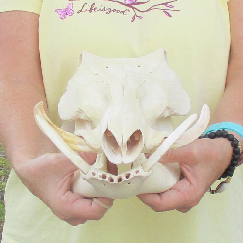 This warthog skull with ivory tusks is from a wild African warthog and may have missing teeth, worn tusk, chipped bones, cuts, scratches, blemishes, tiny holes and scars or have natural imperfections from the animal living in the wild.