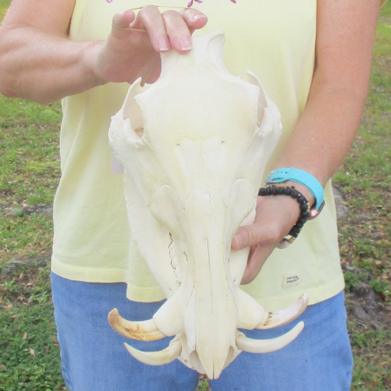 African warthog skull for sale (Phacochoerus aethiopicus) with ivory tusks. The skull measures approximately 12 inches long. The top ivory tusks measure, around the curve, approximately 4 inches long. - Missing teeth. Review all photos. This warthog skull was harvested in South Africa and cleared for entry into the United States by the U.S. Department of Fish and Wildlife and U.S. Customs.