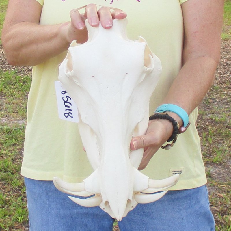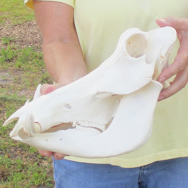 African warthog skull for sale (Phacochoerus aethiopicus) with ivory tusks. The skull measures approximately 12 inches long. The top ivory tusks measure, around the curve, approximately 5 inches long. This warthog skull was harvested in South Africa and cleared for entry into the United States by the U.S. Department of Fish and Wildlife and U.S. Customs.  - Missing teeth. Review all photos.