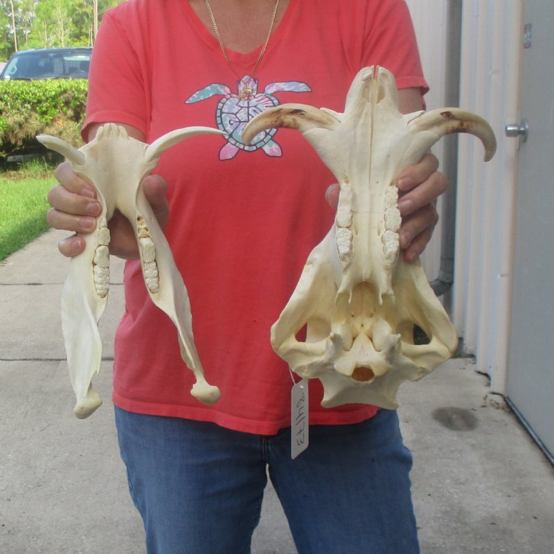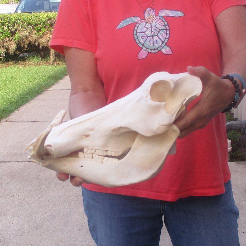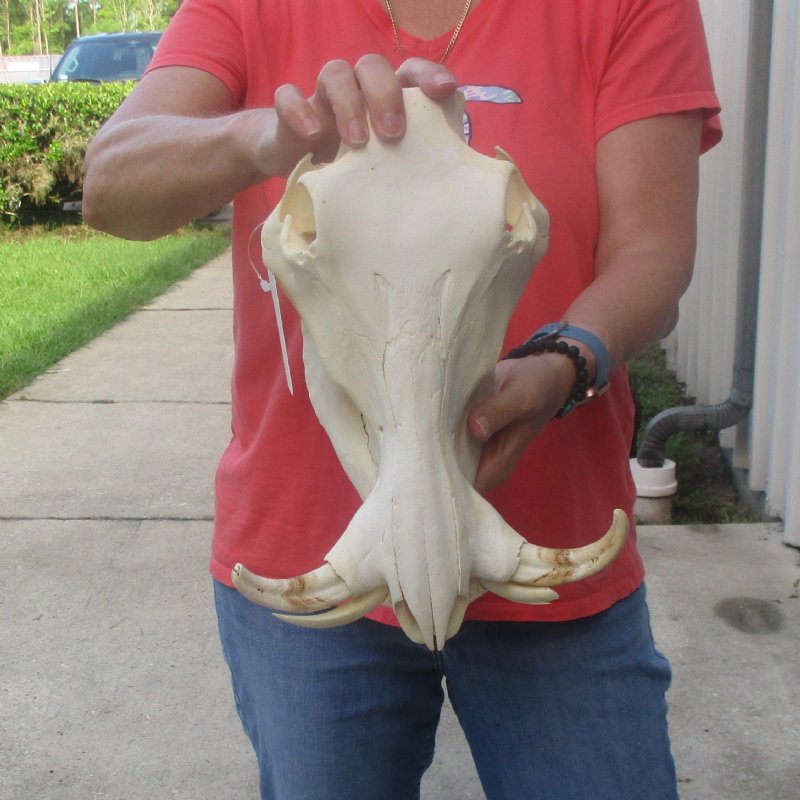 African warthog skull for sale (Phacochoerus aethiopicus) with ivory tusks. The skull measures approximately 12 inches long. The top ivory tusks measure, around the curve, approximately 6 inches long. This warthog skull was harvested in South Africa and cleared for entry into the United States by the U.s. Department of Fish and Wildlife and U.S. Customs.