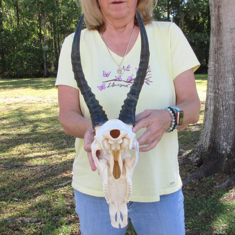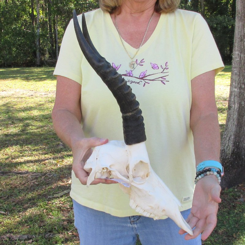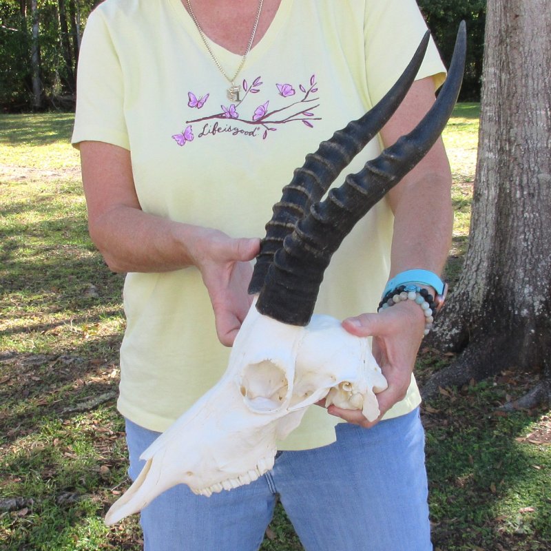 Male Blesbok Skull (Damaliscus dorcas phillipsi) for sale measuring approximately 12 inches. The horns measure approximately 13 inches around the curve of the horns - not straight with a wood ruler. -  Review all photos. These blesbok skulls with horns are commercial grade. They will have imperfections caused by the animal living in the wild - and may include missing teeth, tiny cuts and scratches, discoloration, blemishes and scars.