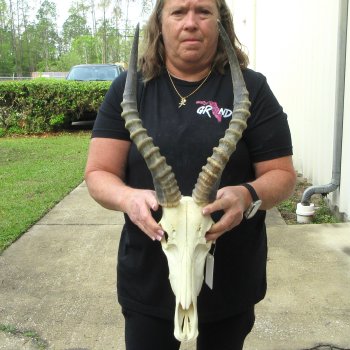 Male Blesbok Skull (Damaliscus dorcas phillipsi) for sale measuring approximately 12 inches. The horns measure approximately 17 inches around the curve of the horns - not straight with a wood ruler. - Missing teeth. Review all photos. These blesbok skulls with horns are commercial grade. They will have imperfections caused by the animal living in the wild - and may include missing teeth, tiny cuts and scratches, discoloration, blemishes and scars.
