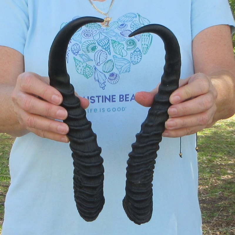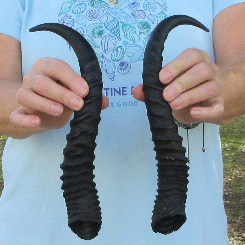 Matching pair of male springbok (Antidorcas marsupialus) horns from wild African male springbok measuring approximately 12 inches long measured around the curve of the horns -- not straight.  Review photos. These are real horns and will have natural imperfections from the animal living in the wild.