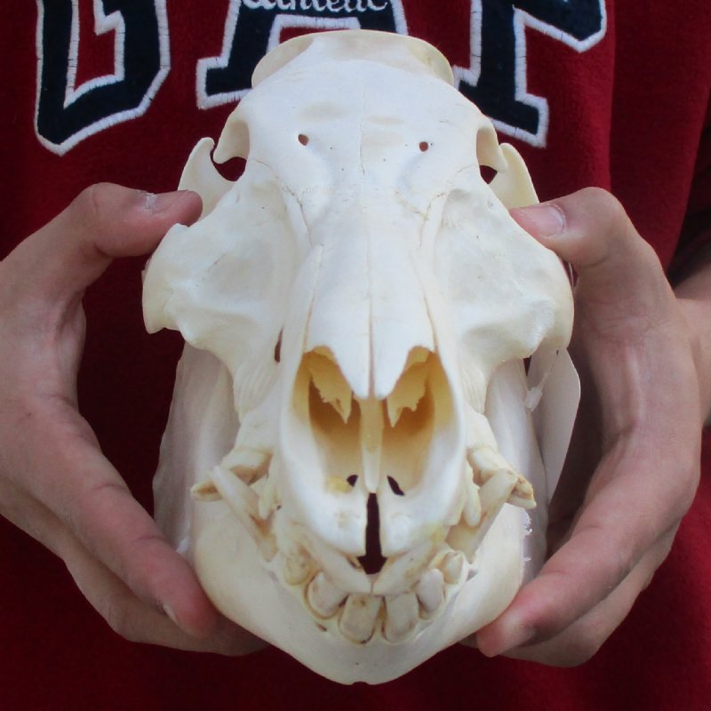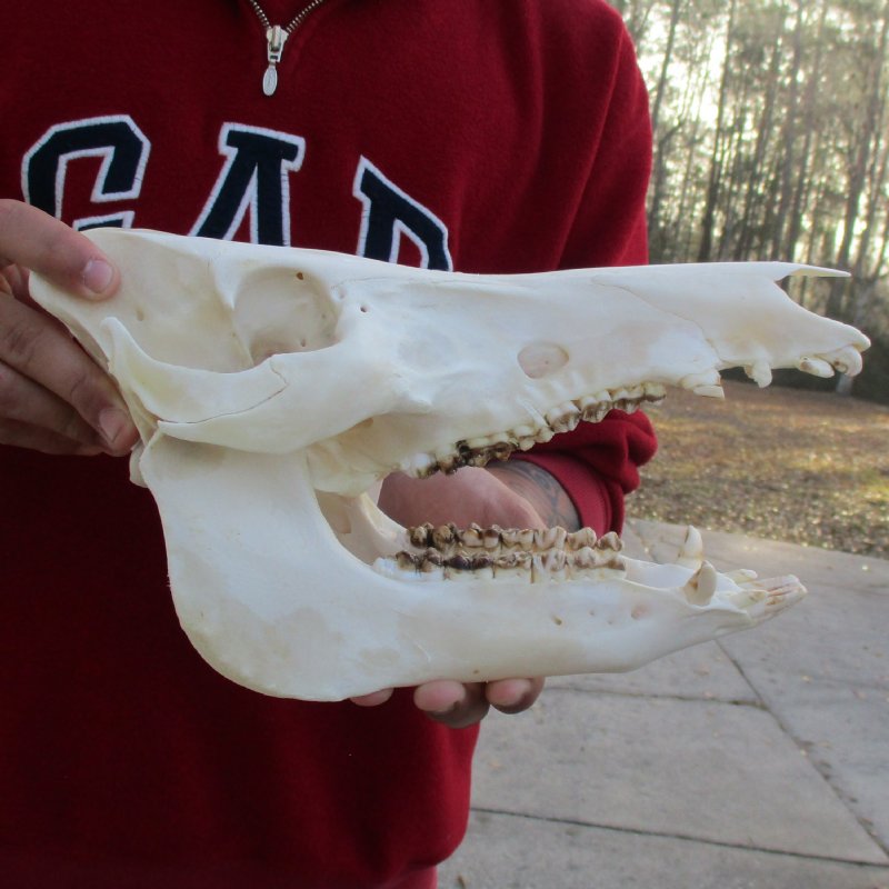 This is a Wild Boar / Wild Pig skull for sale, measuring approximately 12 inches long by 5 inches wide. - Some teeth missing. Review all photos. These boar skulls are commercial grade and may have broken and missing teeth, excessive glue, discoloration and oily residue. This wild boar skull, wild pig skull, has been cleaned (but not whitened) and is ready for display. Wild boar skulls are perfect for skull collectors and collectors of weird and unusual items.