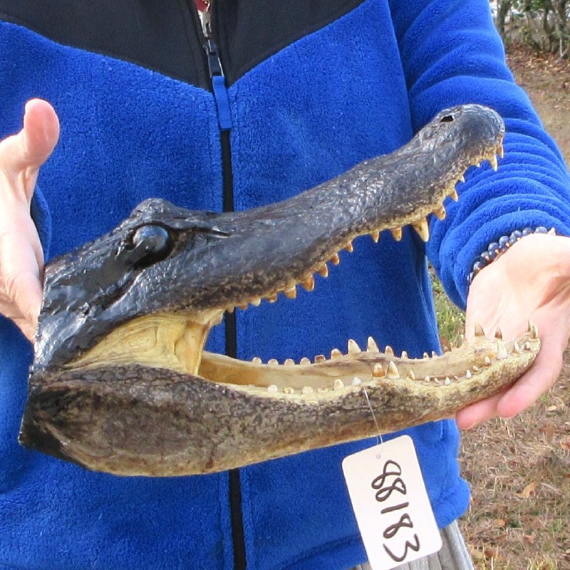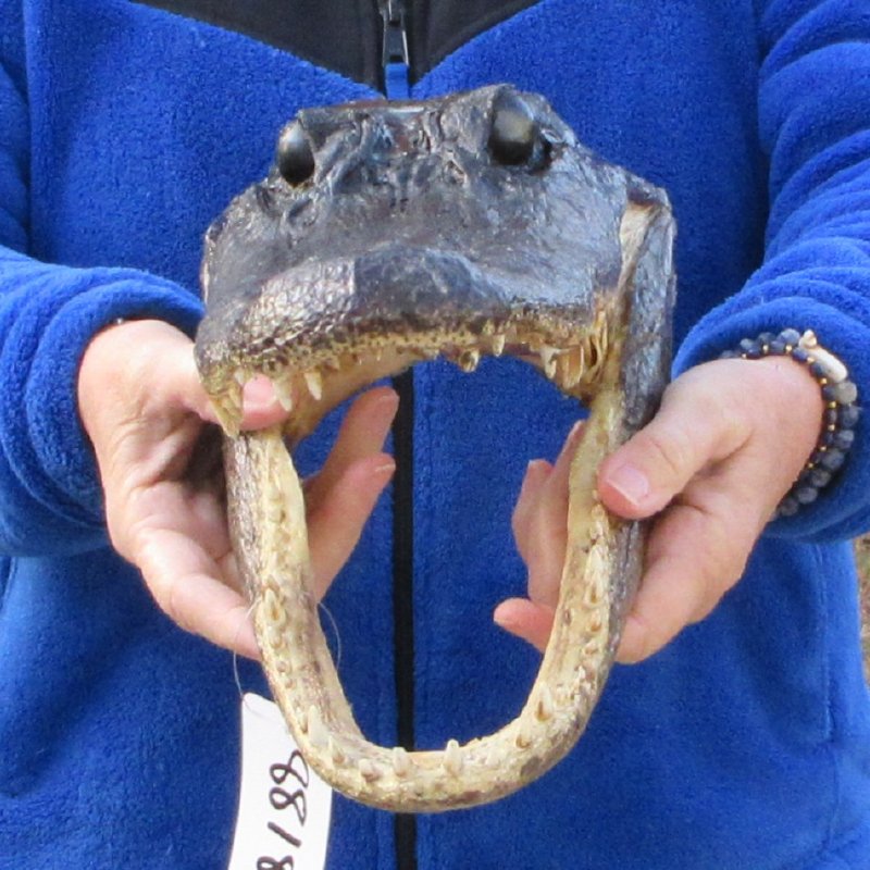 This alligator head measures approximately 13 inches long and 6 inches wide. This is a real alligator head -- NOT a replica. It will have missing and worn teeth, cuts, scrapes and scars -- Review all photos. Alligator head souvenirs are a profitable retail product for beach shops, souvenir and gift stores catering to gator football fans, tourists, reptile collectors, teachers, students, and collectors of unusual items. A taxidermy process cures the alligator skin and the alligator skull so it will be preserved for years. These gator heads come from gator farms who harvest the gators for their meat and hide.