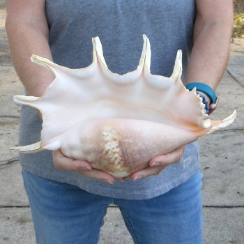 Giant Spider Conch, a large decorative shell, measuring approximately 13 inches long, hand picked out of our large inventory of wholesale spider conch shells. Spider conch shells are referred to as Seba's Spider Conch, Lambis truncata, and are found in the Pacific and Red Sea in shallow water. Giant spider conchs are tan shells with a peach color interior and are large decorative seashells used in coastal home decorating and seashell decor. These shells will have natural imperfections from living in the oceans and aging. They are not specimen grade. - May have damage to the tips. Review all photos.