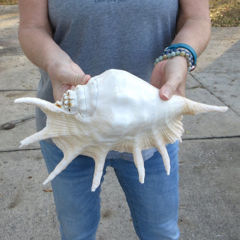 Giant Spider Conch, a large decorative shell, measuring approximately 13 inches long, hand picked out of our large inventory of wholesale spider conch shells. Spider conch shells are referred to as Seba's Spider Conch, Lambis truncata, and are found in the Pacific and Red Sea in shallow water. Giant spider conchs are tan shells with a peach color interior and are large decorative seashells used in coastal home decorating and seashell decor. These shells will have natural imperfections from living in the oceans and aging. They are not specimen grade. - May have damage to the tips. Review all photos.