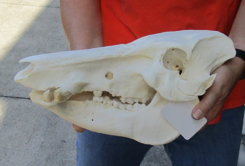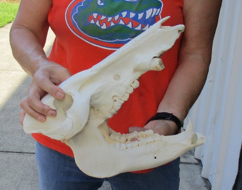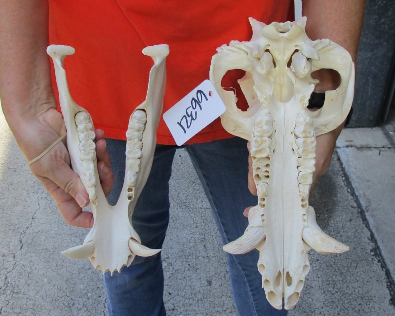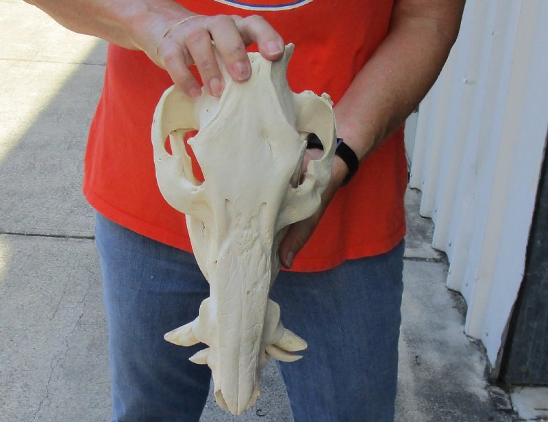 13 inches long and 6 inches wide African Bushpig skull, Potamochoerus larvatus.   This is a real bushpig and will have imperfections from the animal living in the wild and aging, such as: missing teeth, small holes, cracks, indentations, blemishes, scars, etc - review photos. The Bushpig is a member of the pig family and lives in forests, woodland, riverine vegetation and reedbeds in East and Southern Africa. Bushpigs are mainly nocturnal. Bushpigs are quite social animals and are found in sounders of up to 12 members. A typical group will consist of a dominant male and a dominant female, with other females and juveniles accounting for the rest.