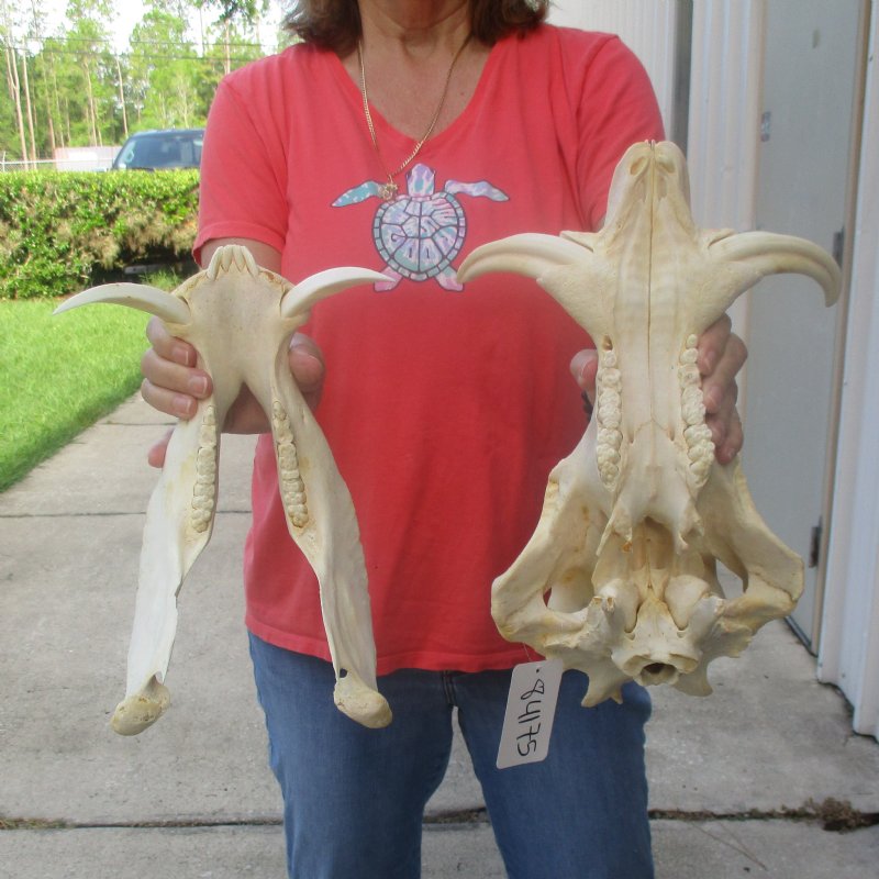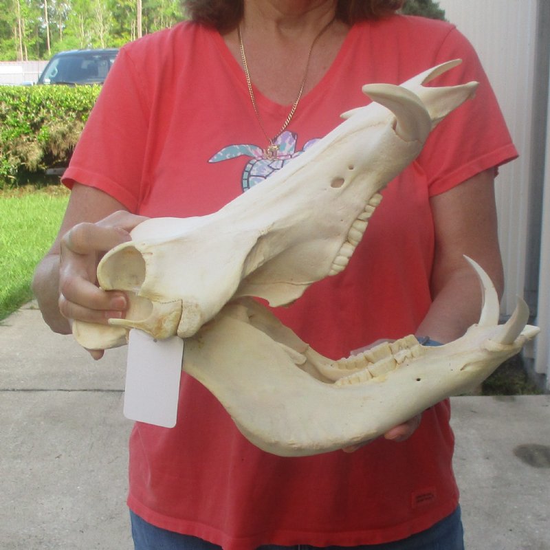 African warthog skull for sale (Phacochoerus aethiopicus) with ivory tusks. The skull measures approximately 13 inches long. The top ivory tusks measure, around the curve, approximately 6 inches long. This warthog skull was harvested in South Africa and cleared for entry into the United States by the U.s. Department of Fish and Wildlife and U.S. Customs.