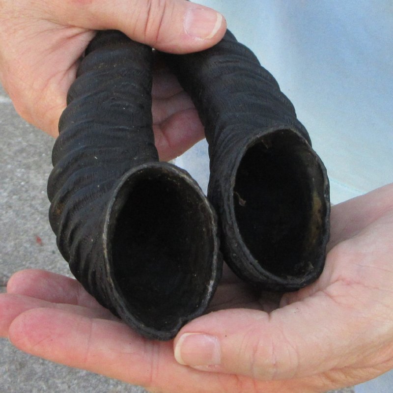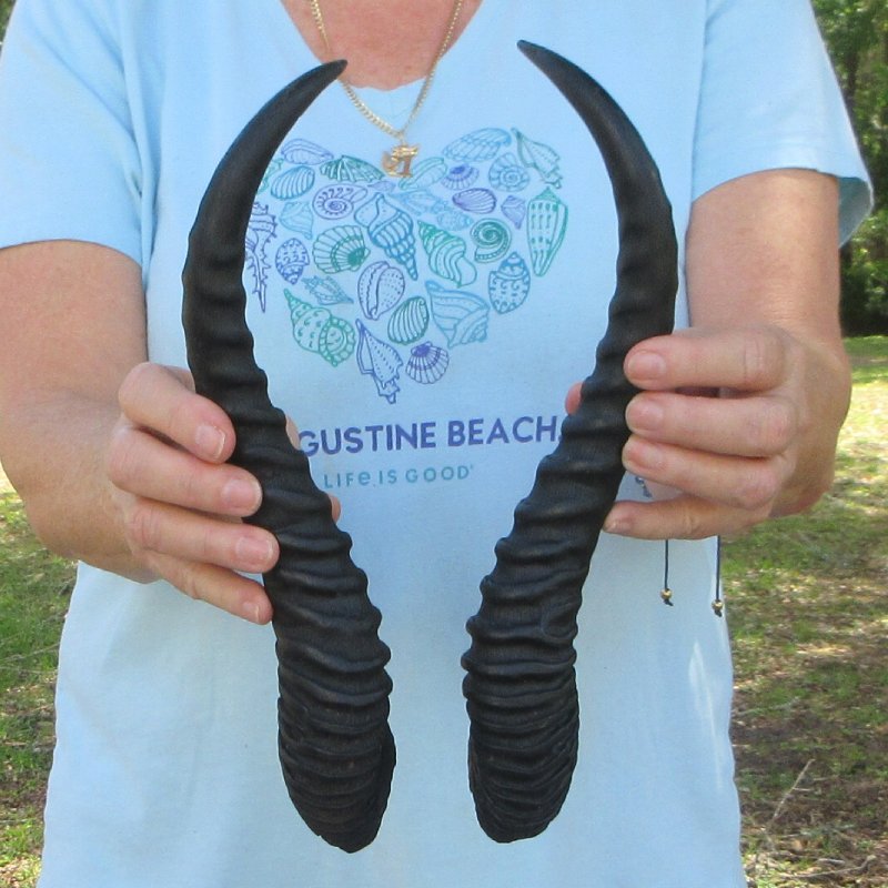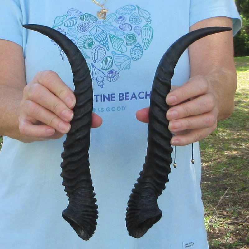 Matching pair of male springbok (Antidorcas marsupialus) horns from wild African male springbok measuring approximately 13 inches long measured around the curve of the horns -- not straight.  Review photos. These are real horns and will have natural imperfections from the animal living in the wild.