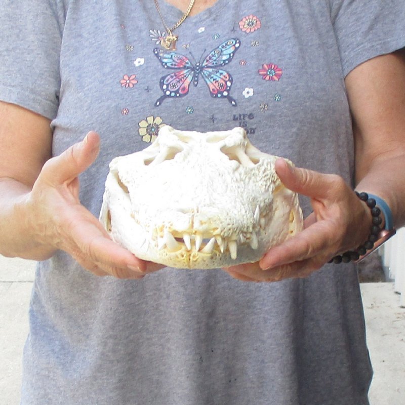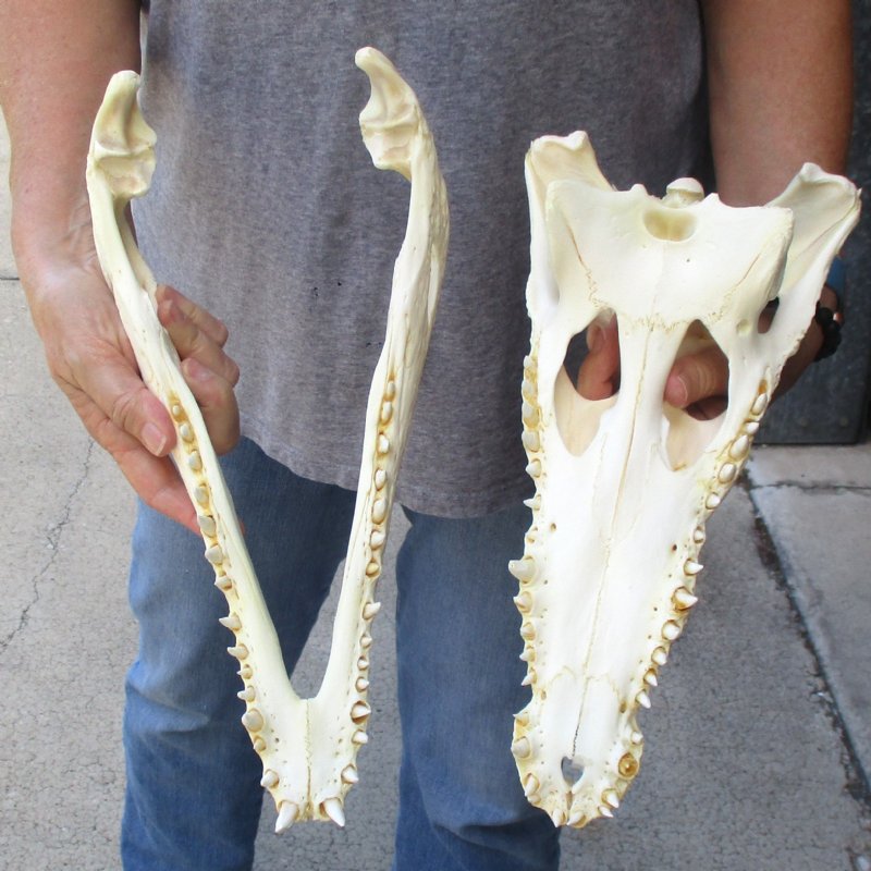 Real Nile Crocodile skull, Crocodylus niloticus, commercial grade quality, measuring approximately 14-1/4 inches long and 6-3/4 inches wide from an estimated 5 foot croc. This skull is off white in color. Our Nile crocodile skulls are imported from South Africa.  They will make a great gift for skull collectors, science teachers and collectors of weird and unusual items. They have been thoroughly cleaned and partially whitened and are ready for display!  The cleaning process used on all skulls to remove the residue of skin, tissue, etc. causes some of the teeth to come out of the skull.  The teeth have been glued back into the skull, however some may be missing.  All of our taxidermy items are commercial grade and imperfect.  They will have imperfections due to the natural aging process and living in the wild--scars, blemishes, rub areas, broken teen, bug bite marks, etc.  These crocodile skulls are by-products of Africa's farming industry.  All products were professional cleaned in South African and cleared by the U.S Fish and Wildlife Services and U.S Customs Services for legal entry into the United States.