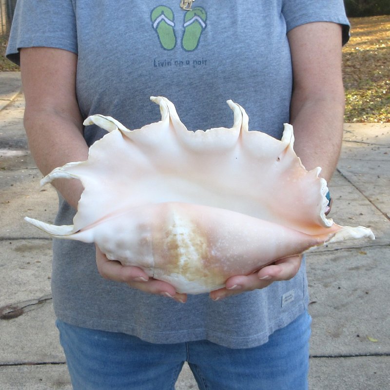 Giant Spider Conch, a large decorative shell, measuring approximately 14 inches long, hand picked out of our large inventory of wholesale spider conch shells. Spider conch shells are referred to as Seba's Spider Conch, Lambis truncata, and are found in the Pacific and Red Sea in shallow water. - May have damage to the tip. Review all photos. Giant spider conchs are tan shells with a peach color interior and are large decorative seashells used in coastal home decorating and seashell decor. These shells will have natural imperfections from living in the oceans and aging. They are not specimen grade.
