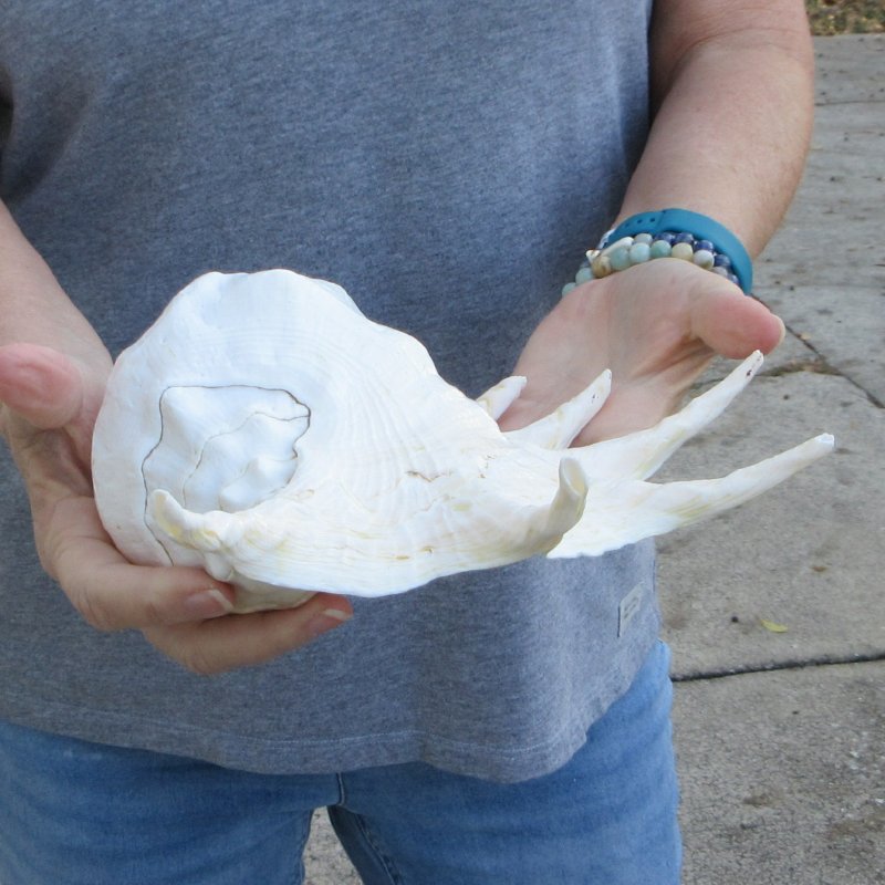 Giant Spider Conch, a large decorative shell, measuring approximately 14 inches long, hand picked out of our large inventory of wholesale spider conch shells. Spider conch shells are referred to as Seba's Spider Conch, Lambis truncata, and are found in the Pacific and Red Sea in shallow water. - May have damage to the tip. Review all photos. Giant spider conchs are tan shells with a peach color interior and are large decorative seashells used in coastal home decorating and seashell decor. These shells will have natural imperfections from living in the oceans and aging. They are not specimen grade.