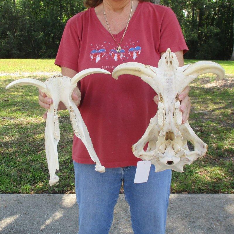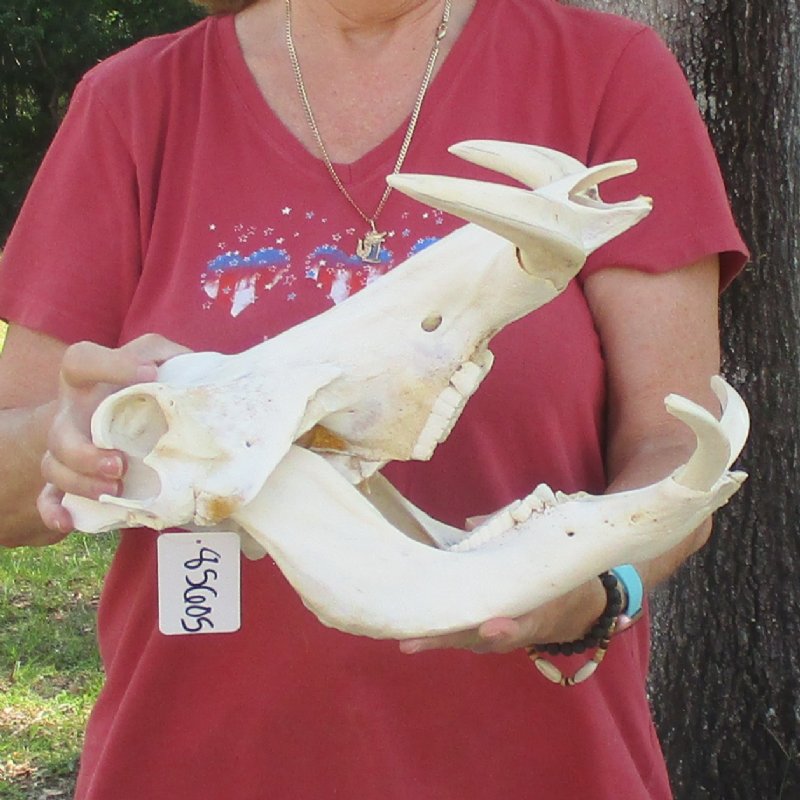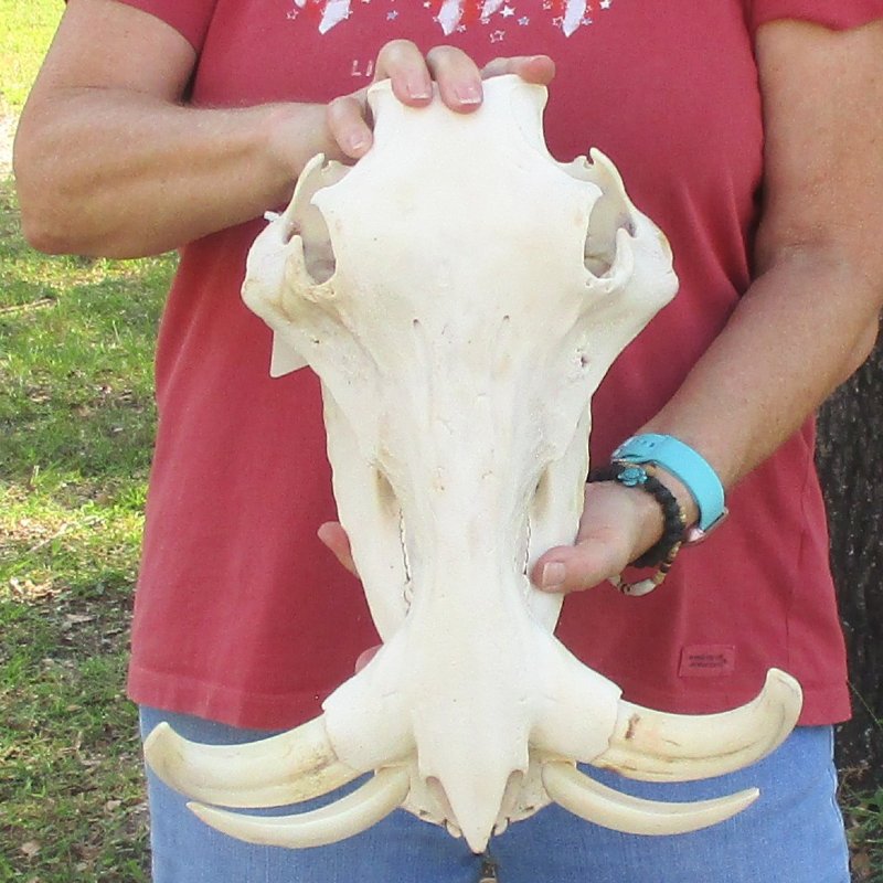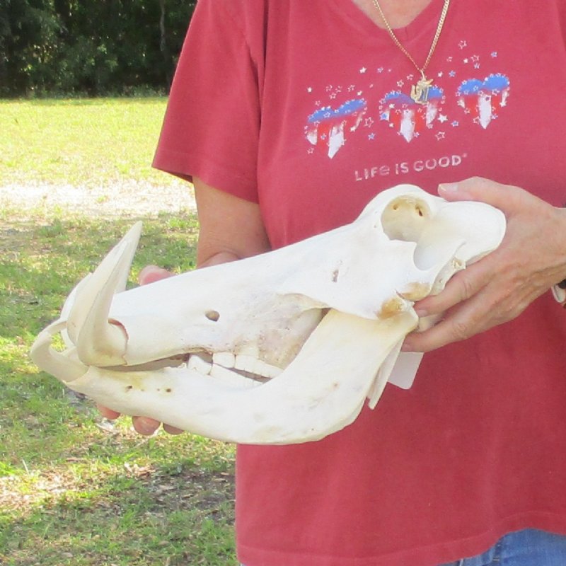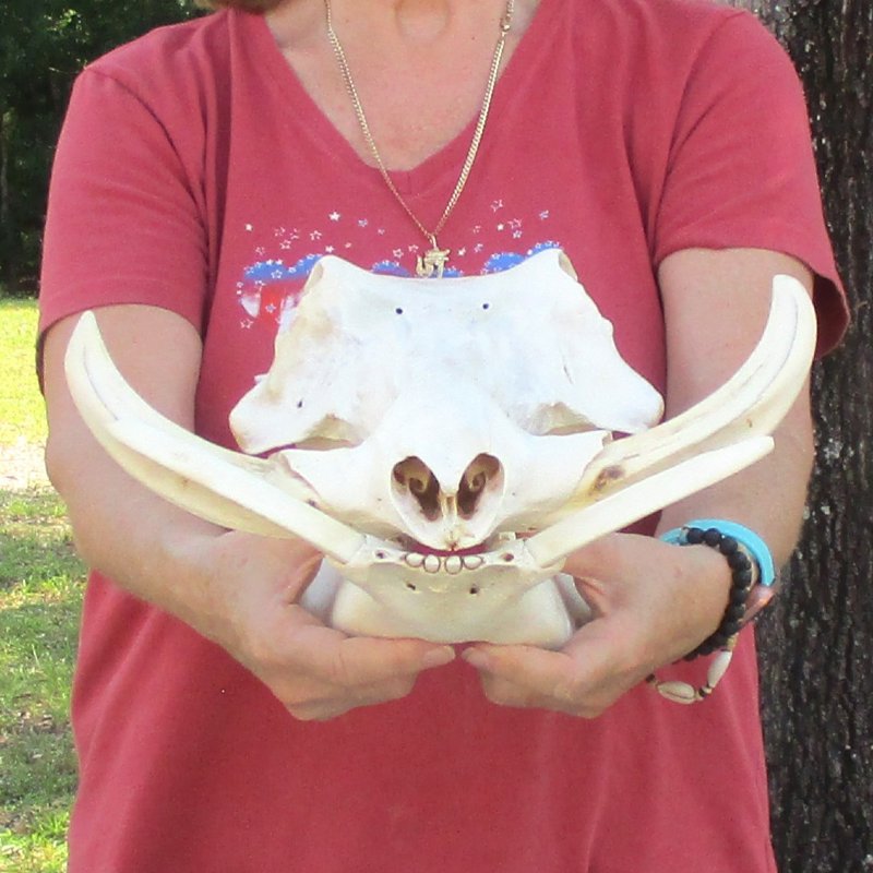 African warthog skull for sale (Phacochoerus aethiopicus) with ivory tusks. The skull measures approximately 14 inches long. The top ivory tusks measure, around the curve, approximately 9-1/2 inches long. This warthog skull was harvested in South Africa and cleared for entry into the United States by the U.s. Department of Fish and Wildlife and U.S. Customs. - Discoloration in several spots on skull. Review all photos.