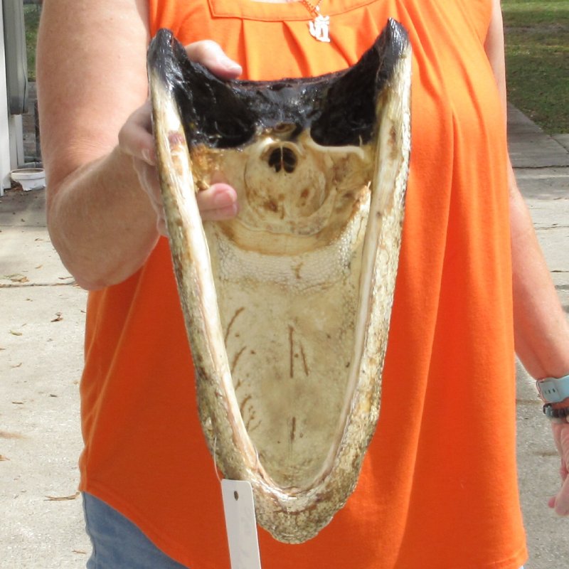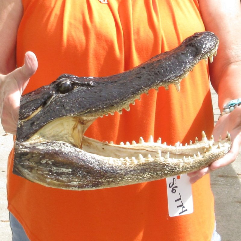 This taxidermy alligator head is from a Louisiana gator (Alligator Mississippiensis)This alligator head measures approximately 14 inches long and 7 inches wide.  This is a real alligator head -- NOT a replica.  It will have missing and worn teeth, cuts, scrapes and scars - Review all photos.  Alligator head souvenirs are a profitable retail product for beach shops, souvenir and gift stores catering to gator football fans, tourists, reptile collectors, teachers, students, and collectors of unusual items.  A taxidermy process cures the alligator skin and the alligator skull so it will be preserved for years.  These gator heads come from gator farms who harvest the gators for their meat and hide.