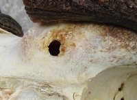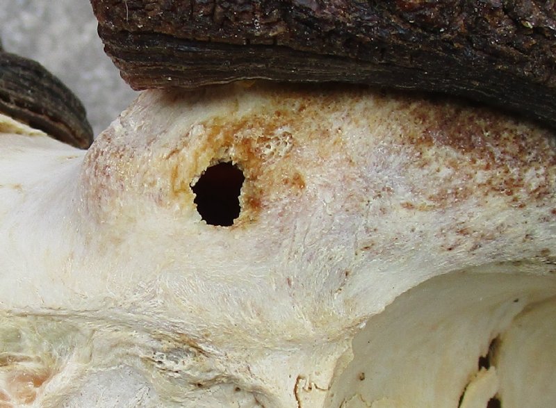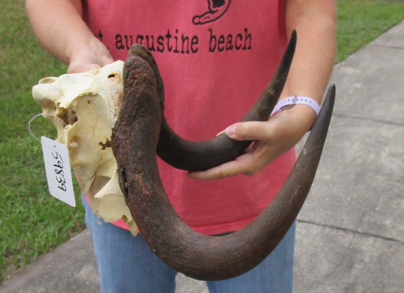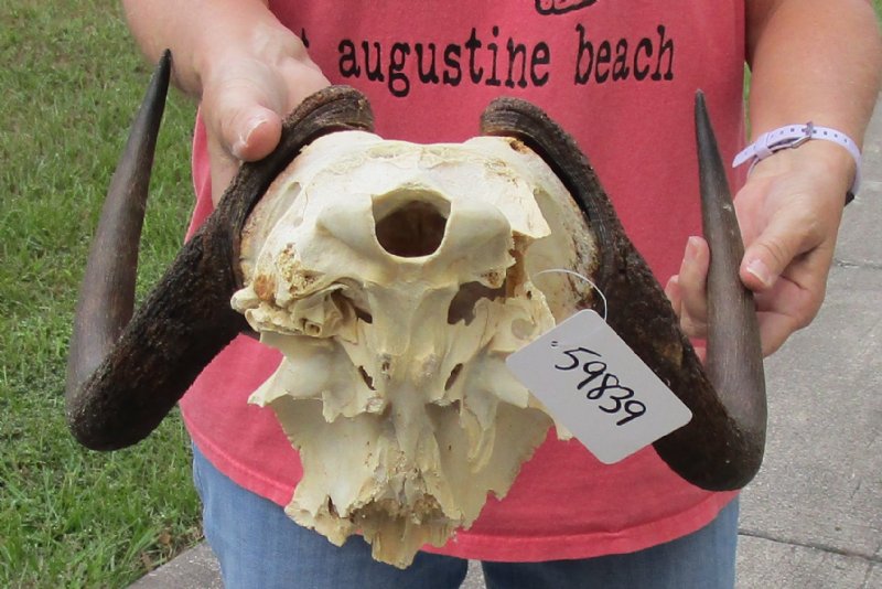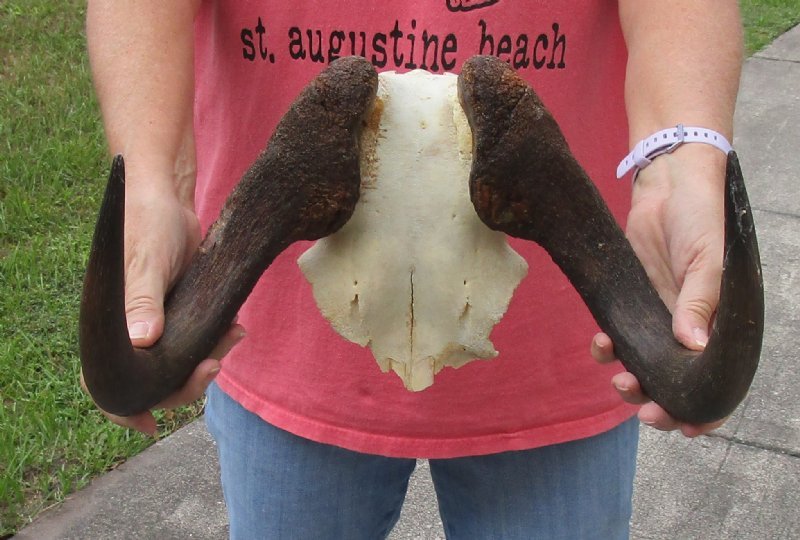 Female African black wildebeest skull plate with horns for cabin decor and lodge decor. Hole in horn and skull plate - review photosThis black wildebeest skull plate has horns approximately 14 inches wide.