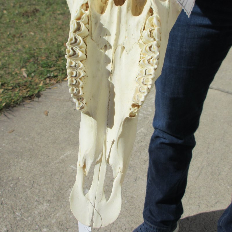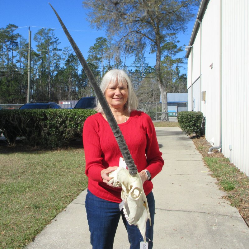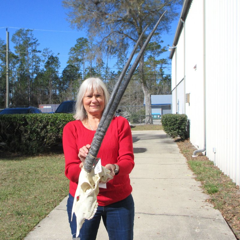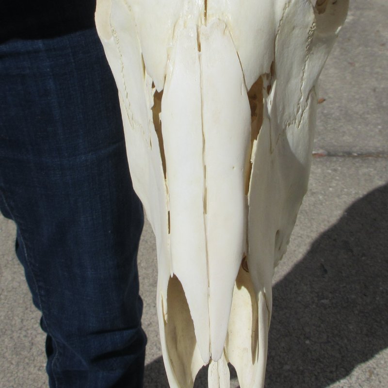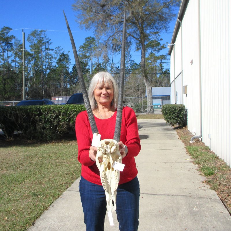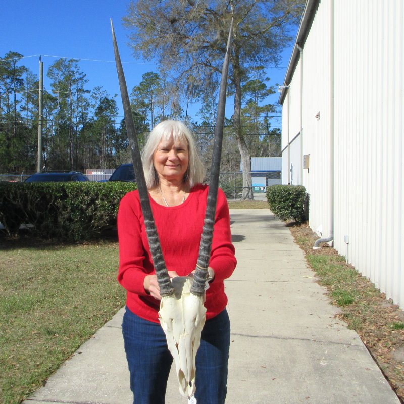 Gemsbok Skull with Horns (Oryx gazella) for sale. The horns measuring approximately 33 inches long. The skull measures approximately 15 inches in length. - Missing teeth and glue repair done. Review all photos. Our gemsbok skulls with horns are from wild African gemsbok and will have imperfections normally found on all wild animal. We are direct importers of African animal skulls & horns. These gemsbok skulls & horns are a by-product of the African government's culling programs and the African farming industry. These skulls & horns have been cleared for legal entry into the U.S. by the U.S. Fish and Wildlife Service and U.S. Customs Department.