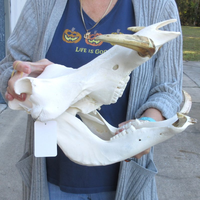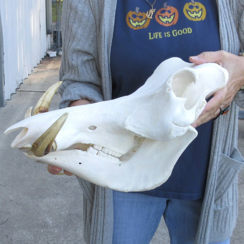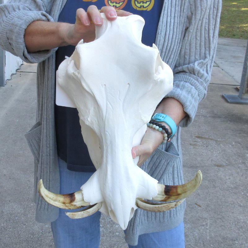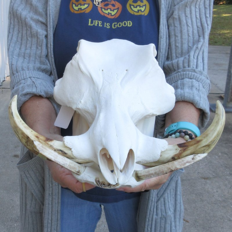 African warthog skull for sale (Phacochoerus aethiopicus) with ivory tusks. The skull measures approximately 15 inches long. The top ivory tusks measure, around the curve, approximately 9 inches long. This warthog skull was harvested in South Africa and cleared for entry into the United States by the U.S. Department of Fish and Wildlife and U.S. Customs.  - Review all photos.