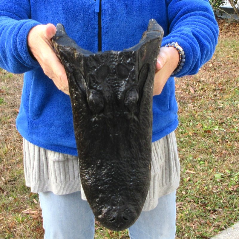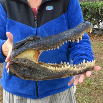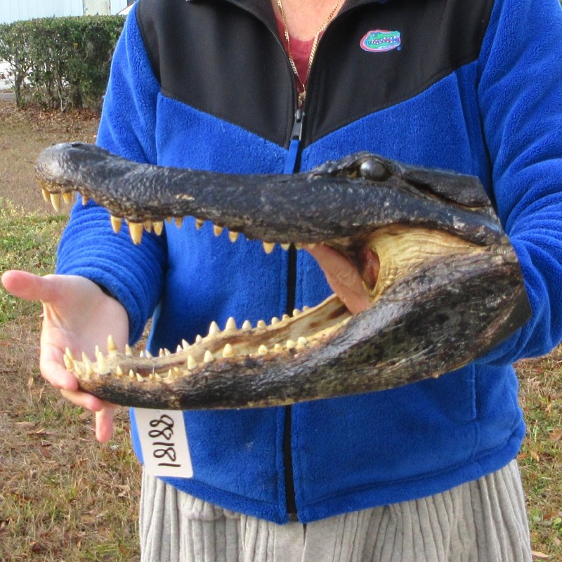 This alligator head measures approximately 16 inches long and 8 inches wide. This is a real alligator head -- NOT a replica. It will have missing and worn teeth, cuts, scrapes and scars --  Review all photos.  Alligator head souvenirs are a profitable retail product for beach shops, souvenir and gift stores catering to gator football fans, tourists, reptile collectors, teachers, students, and collectors of unusual items.  A taxidermy process cures the alligator skin and the alligator skull so it will be preserved for years.  These gator heads come from gator farms who harvest the gators for their meat and hide.