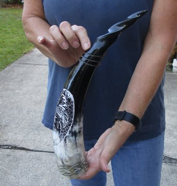 Polished Carved Cattle/Cow horn, with carved birds and a spiral tip design measuring approximately 16 inches measured around the curve of the horn using a cloth tape measure - NOT straight with a wood rulerThe exterior is polished.  The interior is not.  These Polished carved cattle/cow horns with carved birds and a spiral tip design can be used in home decor.