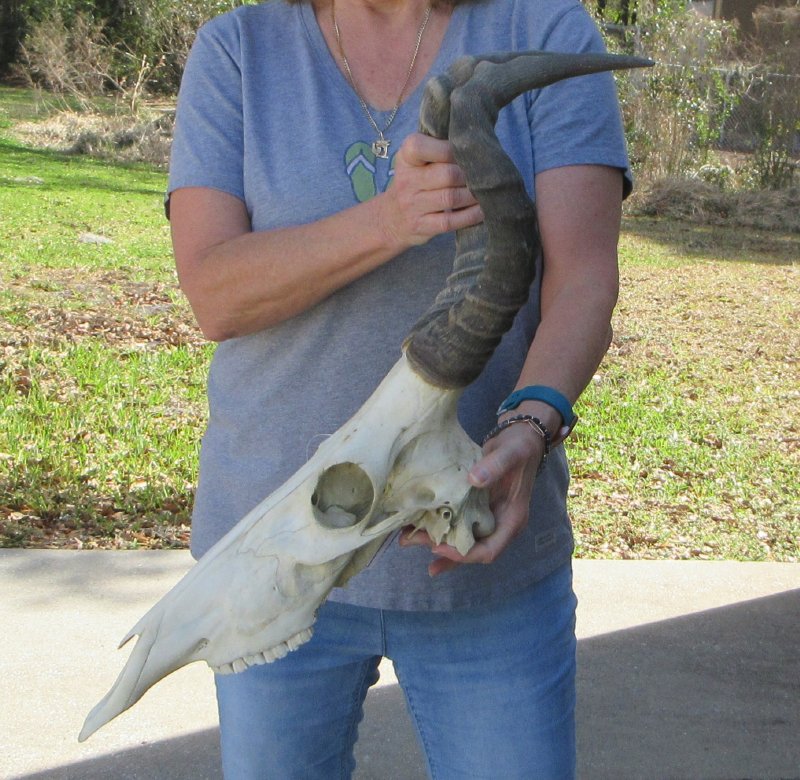 African Red Hartebeest (female) Skull (Alcelaphus buselaphus) with horns for sale. The horns measure approximately 17-1/2 inches, around the curve of the horn -- not straight. Missing one tooth - Review all photos. This red hartebeest skull and horns are from a wild African Red Hartebeest and will have natural imperfections found on all wild animals fighting and living in the wild. All our red hartebeest skull and horns have been imported from South Africa and cleared for legal entry into the U.S. by the U.S. Fish & Wildlife Service and U.S. Customs.