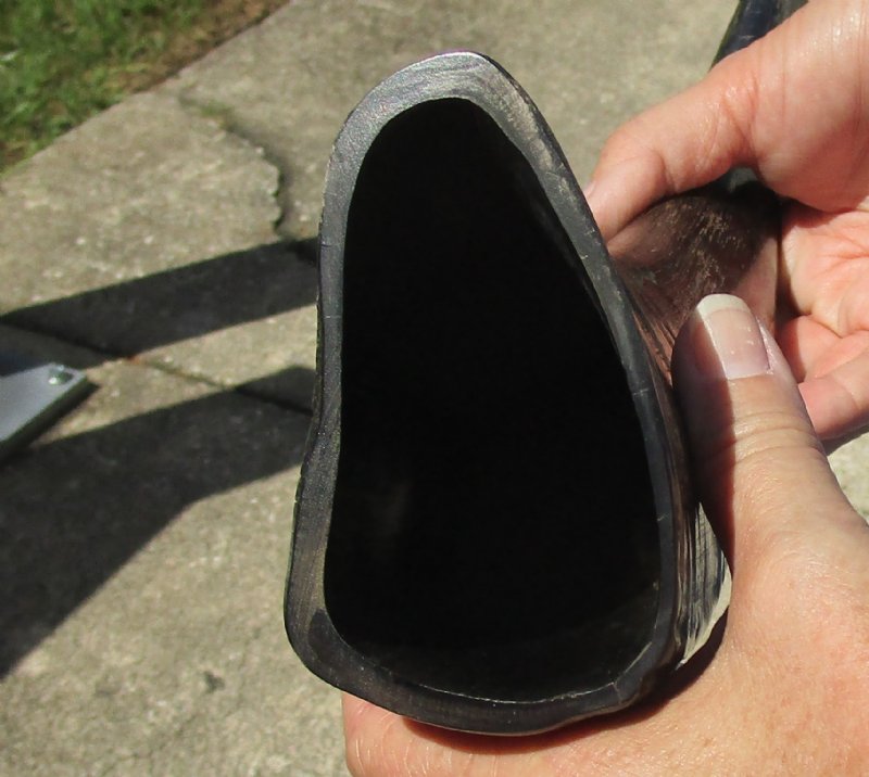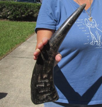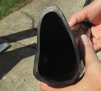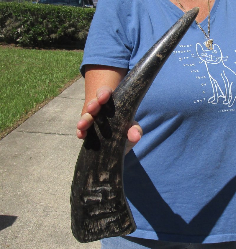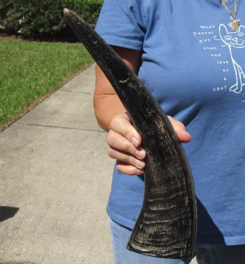 Semi-polished buffalo horn for sale, Bubalus bubalis, from an Indian water buffalo measuring approximately 16 inches measured around the curve of the horn with a cloth tape measure, not straight up and down with ruler.  REVIEW PHOTOS. Semi polished buffalo horns will vary in coloring, size and shape and are used for making animal horn jewelry, in cabin decor, rustic decorating, in making knife and cane handles, for carving, in the art of scrimshaw and in making inlaid instruments.