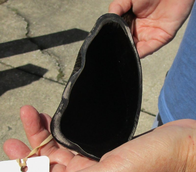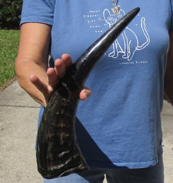 Semi-polished buffalo horn for sale, Bubalus bubalis, from an Indian water buffalo measuring approximately 16 inches measured around the curve of the horn with a cloth tape measure, not straight up and down with ruler.  REVIEW PHOTOS. Semi polished buffalo horns will vary in coloring, size and shape and are used for making animal horn jewelry, in cabin decor, rustic decorating, in making knife and cane handles, for carving, in the art of scrimshaw and in making inlaid instruments.