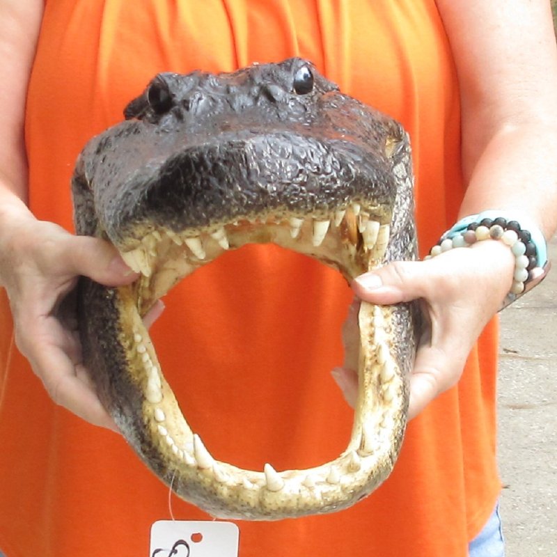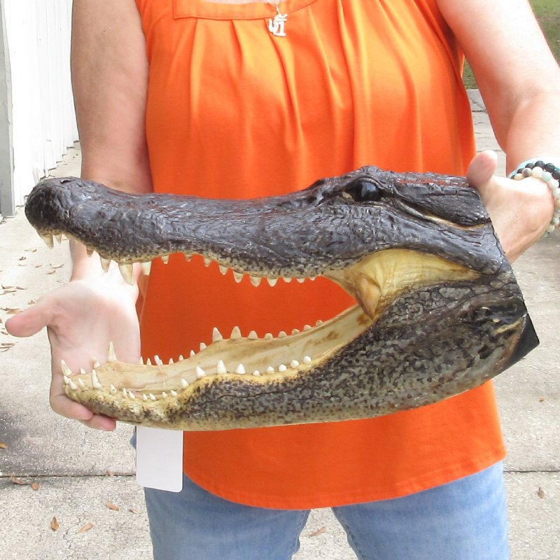 This taxidermy alligator head is from a Louisiana gator (Alligator Mississippiensis)This alligator head measures approximately 17 inches long and 8-1/2 inches wide.  This is a real alligator head -- NOT a replica.  It will have missing and worn teeth, cuts, scrapes and scars - Review all photos.  Alligator head souvenirs are a profitable retail product for beach shops, souvenir and gift stores catering to gator football fans, tourists, reptile collectors, teachers, students, and collectors of unusual items.  A taxidermy process cures the alligator skin and the alligator skull so it will be preserved for years.  These gator heads come from gator farms who harvest the gators for their meat and hide.