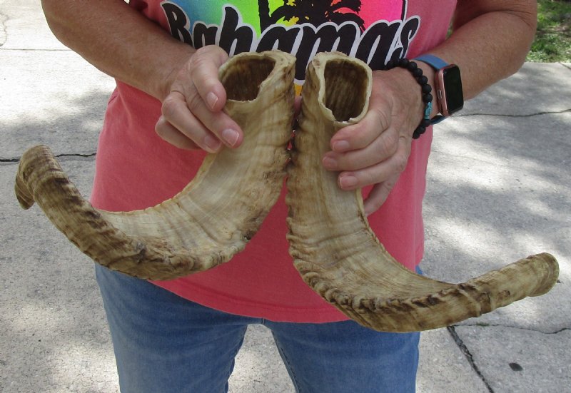 Matching pair of sheep horns or Ram horns (Ovis aries)  measuring approximately 19 and 20 inches around the curl.   Review photos. Sheep horns and ram horns are measured around the curve of the horn - not straight.  Large sheep horns will have natural imperfections including, gouges, holes, splits, missing sections of top layer, etc. from aging and fighting.   Ram horns and sheep horns are used in making blowing horns, furniture legs, lamps, sconces, knife handles, cane handles, inlaid crafts and numerous other taxidermy crafts. Our ram sheep horns are a by-product of the farming industry and Government culling programs. The ram sheep horns have been professionally cleaned in Africa and India and cleared for entry into the United States by the U.S. Fish and Wildlife Service and U.S. Customs.