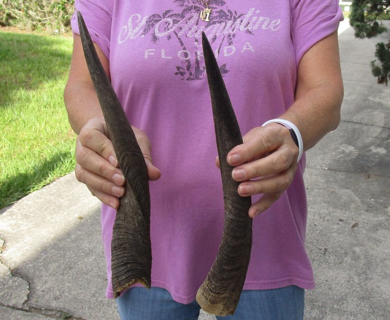 Two pc lot of Bushbuck horns from wild African bushbuck, with natural imperfections, measuring approximately 12-5/8 and 12-3/4 inches long measured around the curve of the horns -- not straight. These are not a pair. review photos.  Bushbuck horns, are used in making furniture, cane handles and in numerous taxidermy crafts.