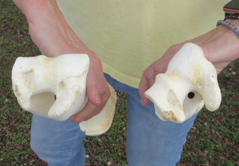 Two piece lot of B-Grade Buffalo Humerus (Bubalus bubalis) leg bones measuring approximately 10 and 11 inches long. This Buffalo Leg Bone was cleaned and whitened and imported from India. These bones will have some cracks, missing chunks of bone, especially near the edges or joints. tiny holes, fine lines, chipped edges and stains or discoloration - Review all photos. Buffalo leg bones are used for carving, scrimshaw art, and for numerous other craft projects.