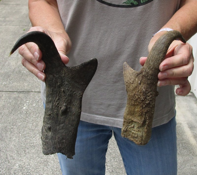 2 piece lot of North American Pronghorn (Antilocapra americana) horns measuring approximately 10-1/2 and 12 inches long.   The prong horn is a species of artiodactyl (even-toed, hoofed) mammal indigenous to interior western and central North America.  There will be imperfections due to the natural aging process and living in the wild--scars, blemishes, rub areas, etc.  Because this is a natural product, it does have an odor.