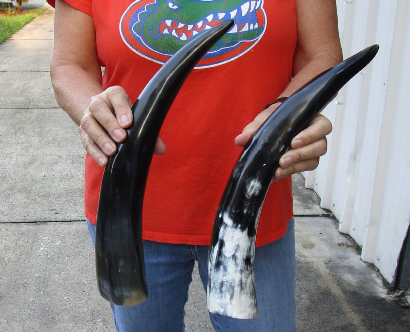 Two piece lot of Polished Water Buffalo (Bubalus-bubalis) Horns imported from India measuring 16 inches long each. Polished water buffalo horns are measured around the curve of the horn.