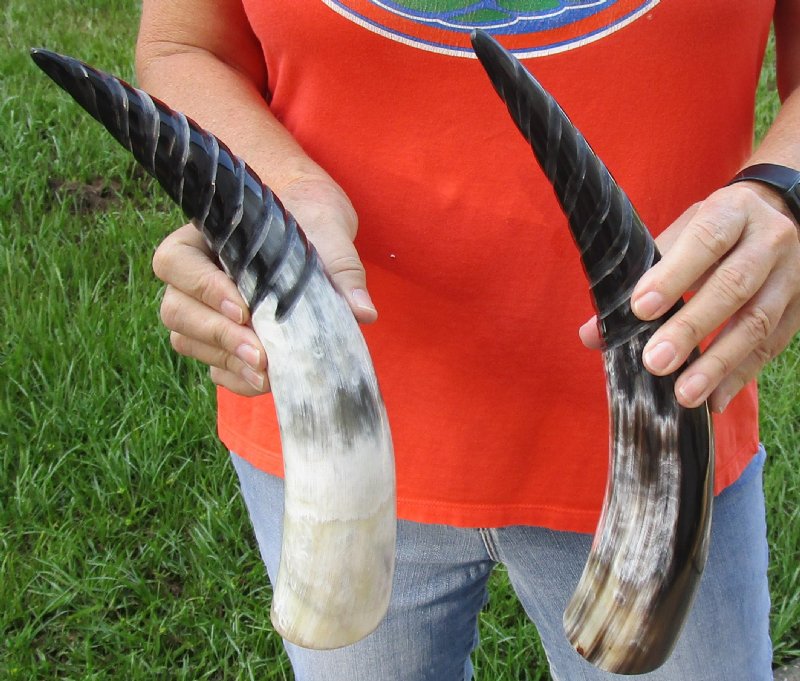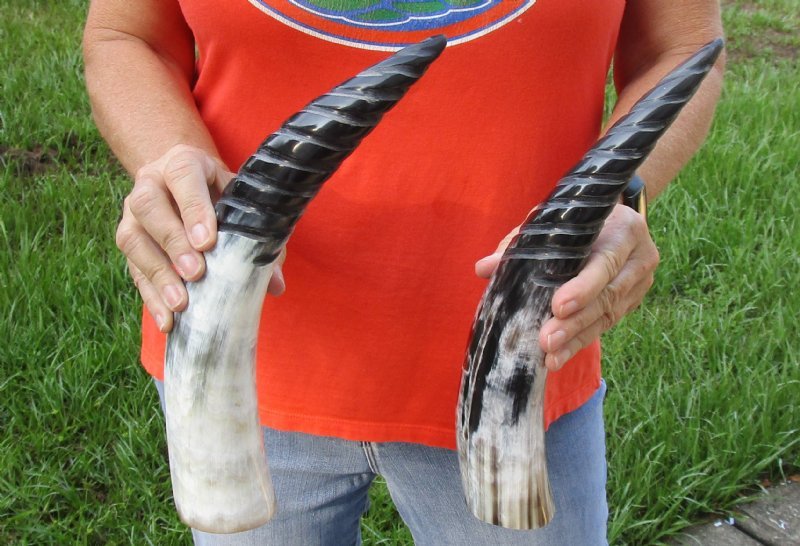 2 pc lot of Spiral Carved Polished Cattle/Cow horns both measuring approximately 13 inches and 14 inches, measured around the curve of the horn using a cloth tape measure - NOT straight with a wood ruler.  Carved Polished Cattle/Cow horns vary in coloring, size and shape and are used for making animal horn jewelry, in cabin decor, rustic decorating, in making knife and cane handles, for carving, in the art of scrimshaw and in making inlaid instruments.