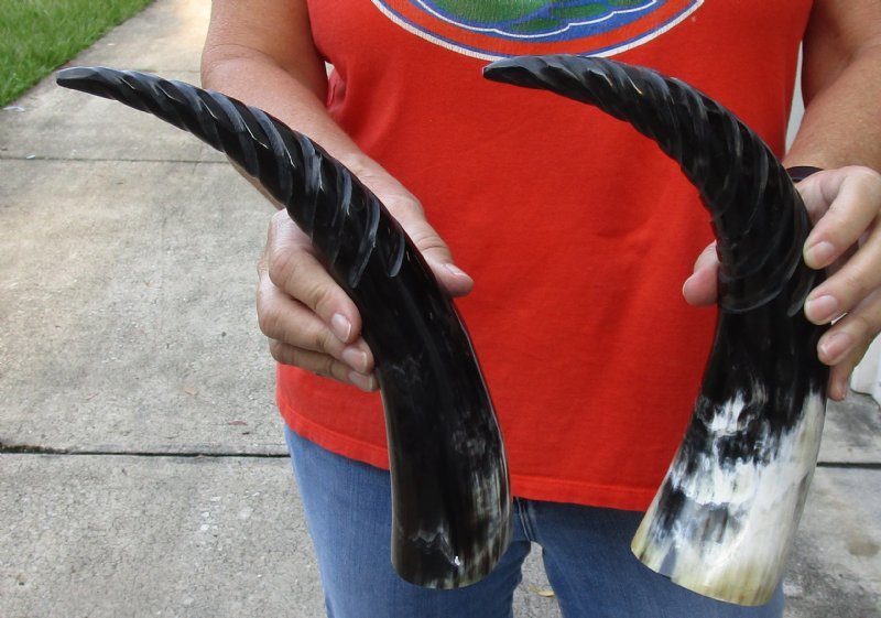 2 pc lot of Spiral Carved Polished Cattle/Cow horns both measuring approximately 13 inches and 14 inches, measured around the curve of the horn using a cloth tape measure - NOT straight with a wood ruler.  Carved Polished Cattle/Cow horns vary in coloring, size and shape and are used for making animal horn jewelry, in cabin decor, rustic decorating, in making knife and cane handles, for carving, in the art of scrimshaw and in making inlaid instruments.