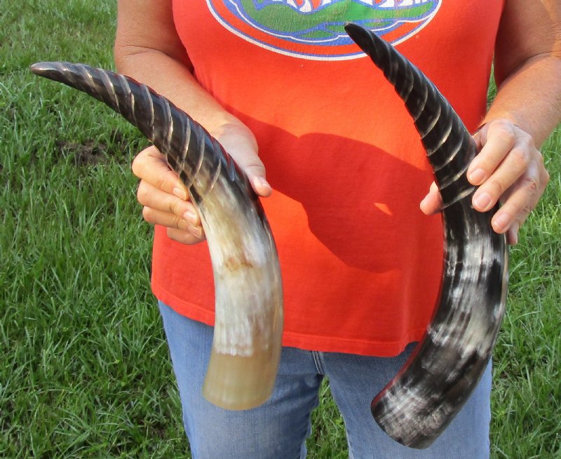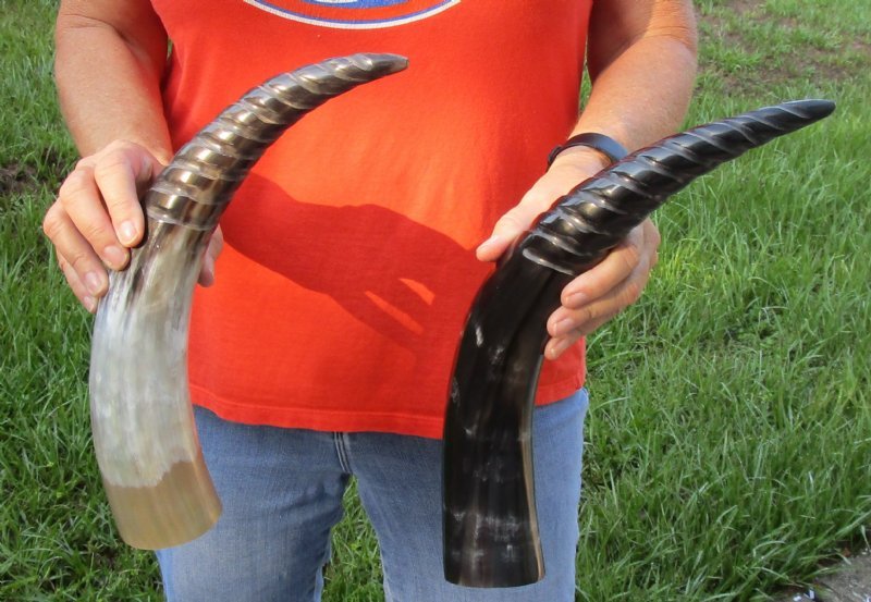 2 pc lot of Spiral Carved Polished Cattle/Cow horns measuring approximately 16 and 17 inches, measured around the curve of the horn using a cloth tape measure - NOT straight with a wood ruler.  Carved Polished Cattle/Cow horns vary in coloring, size and shape and are used for making animal horn jewelry, in cabin decor, rustic decorating, in making knife and cane handles, for carving, in the art of scrimshaw and in making inlaid instruments.