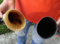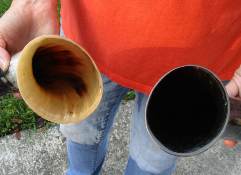 Some of these horns have a tiny patch at the tip of the horn where a tiny hole was drilled to release the pressure and allow removal of the inner bone.