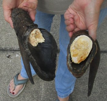 2 piece lot of African black wildebeest horns with bone inside, Connochaetes gnou, for cabin decor and lodge decorThese black wildebeest horns measure approximately 17 and 19 inches long, measured around the curl of the horn with a cloth tape measure, not up and down with a straight ruler.  The bone (horn core) is still inside the horns - Review all photos.  African black wildebeest horns can be used in an African themed decorating, cabin decor and lodge decor.  These African black wildebeest horns have been cleared by the U.S Fish and Wildlife Department and U.S Customs Department for legal entry into the U.S.  They are from the farming and government culling industry.