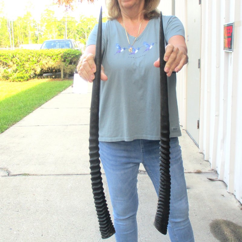 2 piece lot of Genuine Gemsbok, Oryx horns (Oryx gazella) for sale measuring approximately 30-1/4 and 28-1/4 inches long, measured around the curve of the horn.   These horns are not a matching pair - review photos. Gemsbok horns are used for making gemsbok bows, gemsbok horn shofars, furniture and blowing horns. Gemsbok horns are also used in crafting furniture, knife and cane handles and in numerous other taxidermy crafts. These horns are from a wild gemsbok and will have natural imperfections from the animal fighting and living in the wild. Our gemsbok horns are from wild African gemsbok and will have imperfections normally found on all wild animal horns.  We are direct importers of African animal horns.  These gemsbok horns are by-product of the African government's culling programs and the African farming industry.  These horns have been cleared for legal entry into the U.S by the U.S Fish and Wildlife Service and U.S Customs Department.