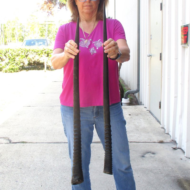 2 piece lot of Genuine Gemsbok, Oryx horns (Oryx gazella) for sale measuring approximately 33 inches long, measured around the curve of the horn.   These horns are not a matching pair - review photos. Gemsbok horns are used for making gemsbok bows, gemsbok horn shofars, furniture and blowing horns. Gemsbok horns are also used in crafting furniture, knife and cane handles and in numerous other taxidermy crafts. These horns are from a wild gemsbok and will have natural imperfections from the animal fighting and living in the wild. Our gemsbok horns are from wild African gemsbok and will have imperfections normally found on all wild animal horns.  We are direct importers of African animal horns.  These gemsbok horns are by-product of the African government's culling programs and the African farming industry.  These horns have been cleared for legal entry into the U.S by the U.S Fish and Wildlife Service and U.S Customs Department.