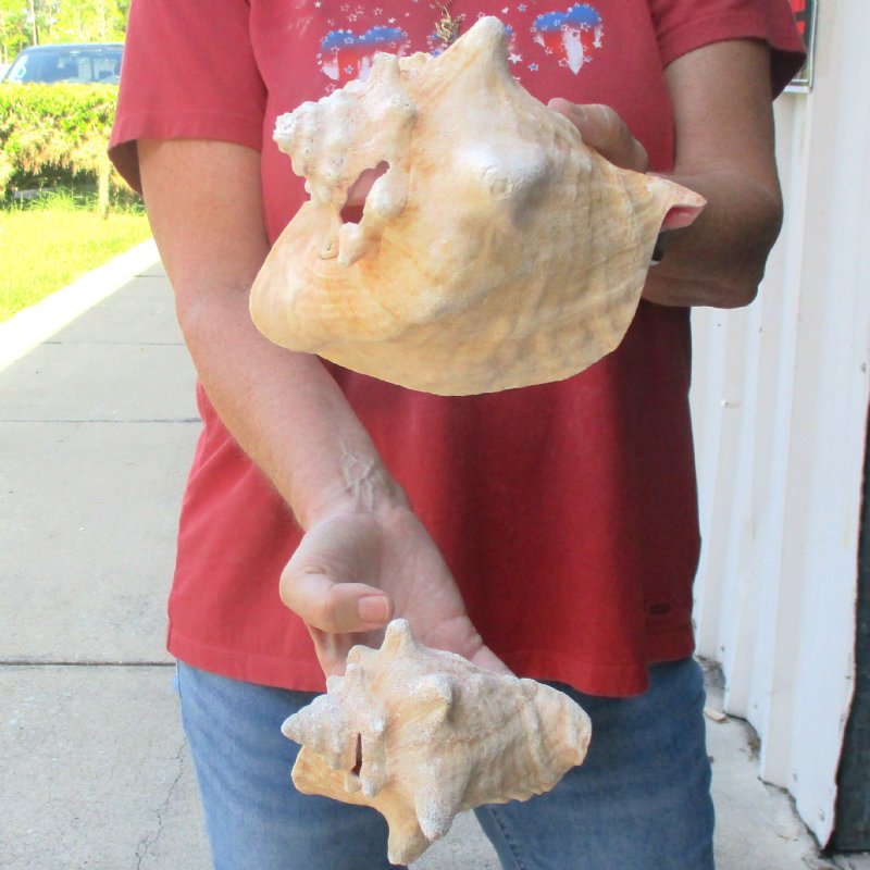 This is a 2 Piece Lot of 5-1/2 & 7 inch B-Grade Pink Conch Shells for sale (Strombus gigas), large shells for decorating.   These shells measure approximately 8 inches long. These conchs will have a slit in the back of the shell, done to quickly remove the meat.  The lips have been machine edged.  These are B-Grade Shells - they will have calcium build-up, worm holes, chipped edges, broken or damaged points, etc. - review photos.  Pink conchs are found in Southeast Florida, Bermuda and the West Indies. Pink conch shells are great for display in your home or around a pool area or in a garden.