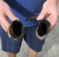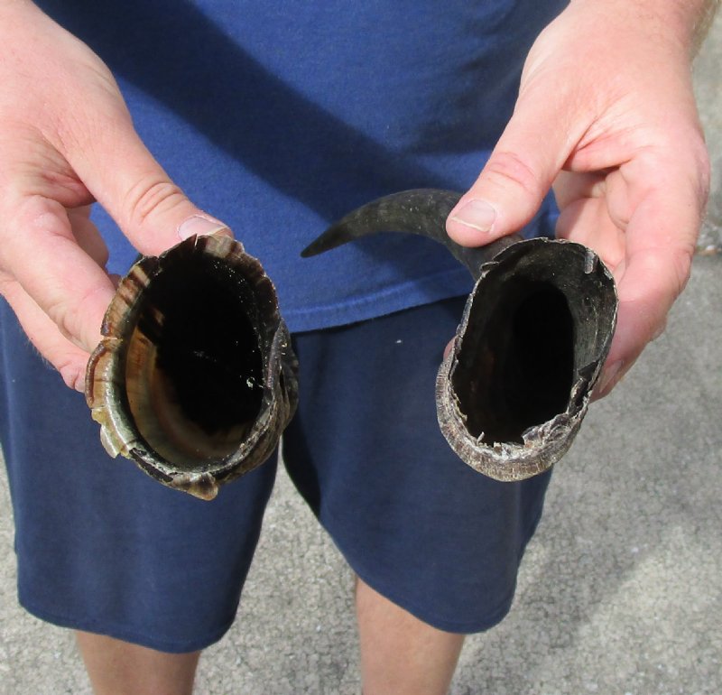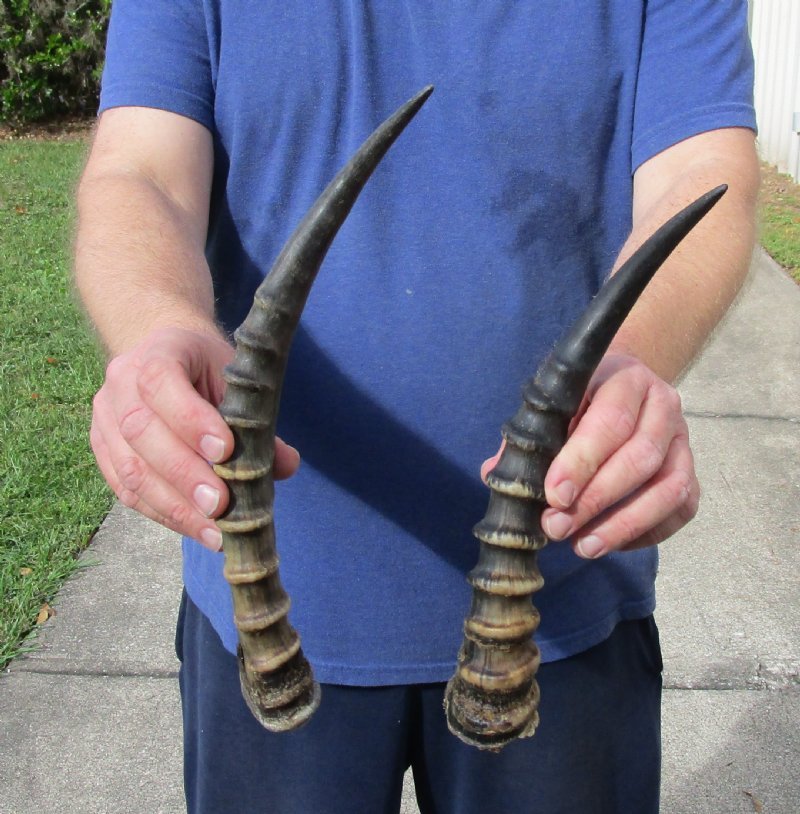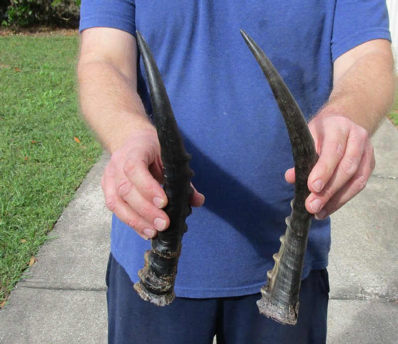 Two (2) piece lot of male blesbok (Damaliscus dorcas phillipsi) horns from wild African blesbok measuring approximately 12 and 13 inches long measured around the curve of the horns with a tape measure -- not straight  THESE HORNS ARE NOT A MATCHING PAIR! - Review all photos. Blesbok horns, blesbuck horns, are used in making furniture, cane handles and in numerous taxidermy crafts. These are real horns and the blesbok horns will have natural imperfections from living in the wild.
