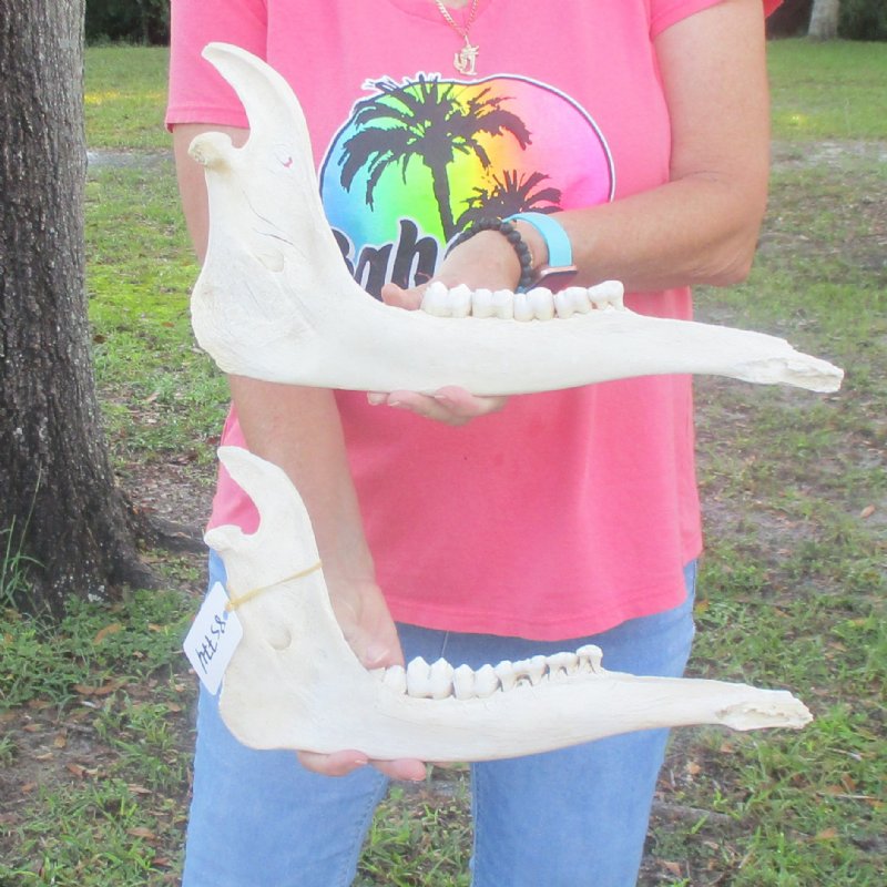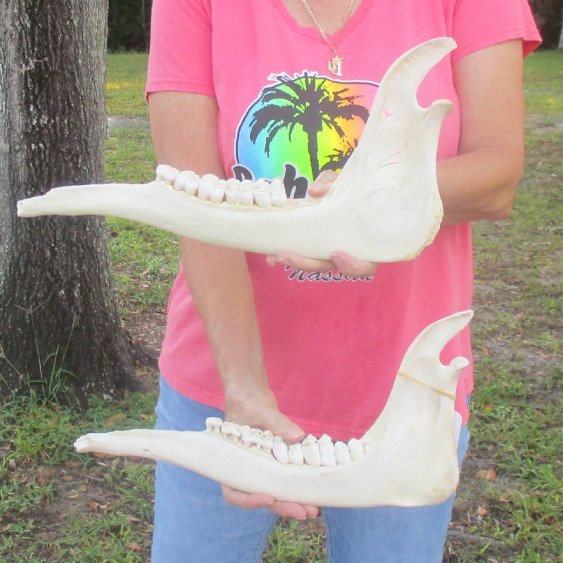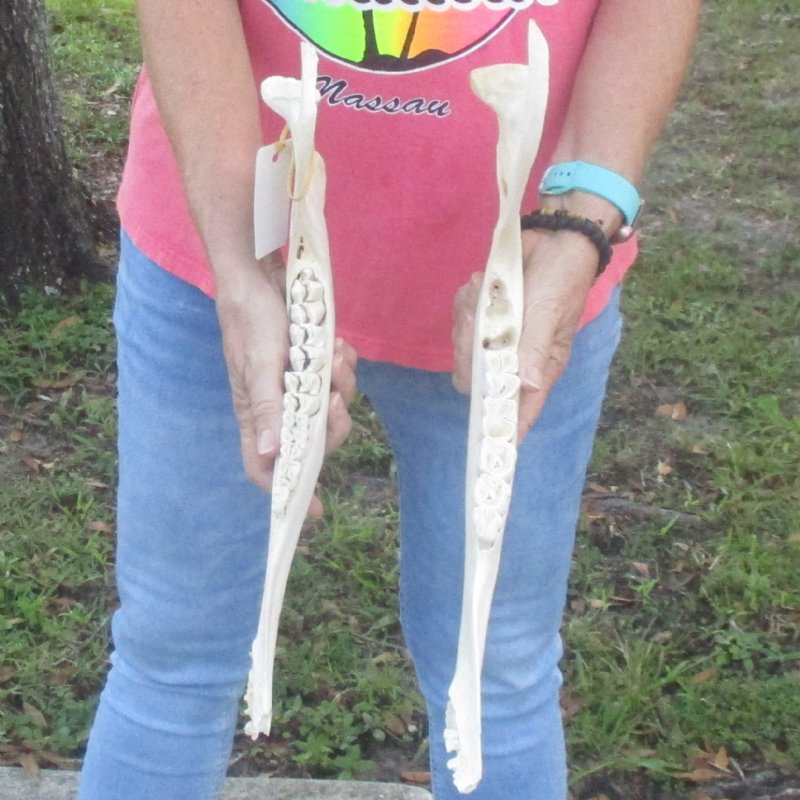 2 pieces of Giraffe Jaw Bones (Giraffa camelopardalis) for sale, measuring approximately 15 and 16 inches in length. -Teeth missing. Review all photos. These giraffe lower jaw bones were harvested and professionally cleaned in Africa. They are from real African Giraffes and will have natural imperfections found on all wild animal skulls due to the natural aging process and living in the wild, such as scars, blemishes, broken, chipped and missing teeth, cuts, discoloration and other imperfections. These Giraffe jaws were cleared by the U.S. Fish and Wildlife Services and U.S. Customs Services for legal entry into the United States.