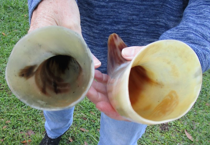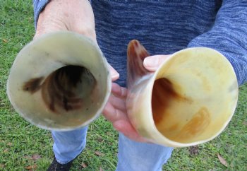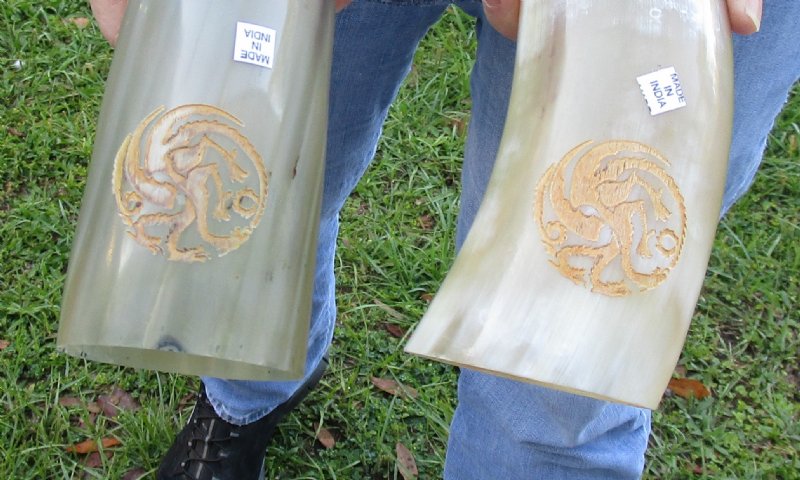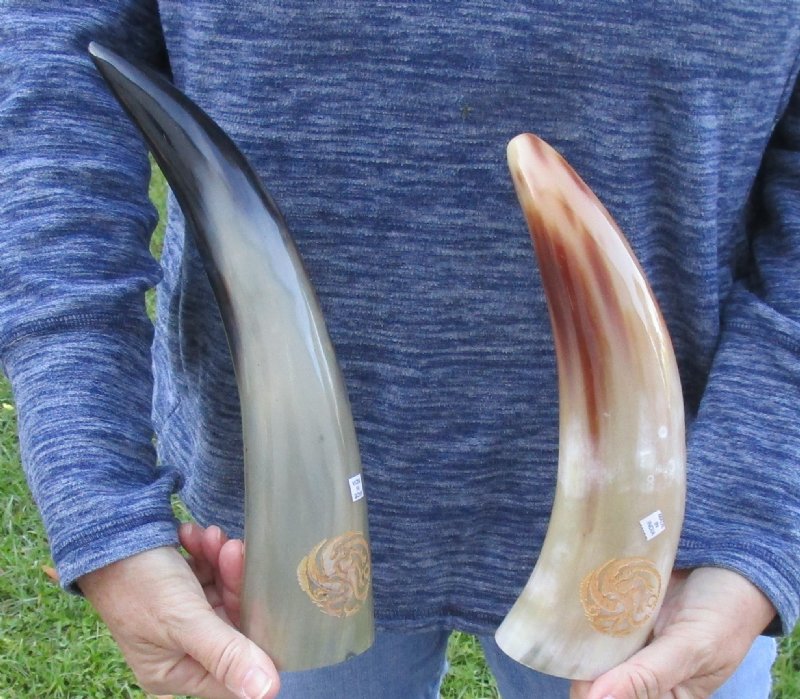 2 piece lot of Polished Engraved Dragon Cattle/Cow horns measuring approximately 11 inches and 13 inches measured around the curve of the horn using a cloth tape measure - NOT straight with a wood rulerThe exterior is polished.  The interior is not.  These Polished engraved dragon cattle/cow horns can be used in home decor.